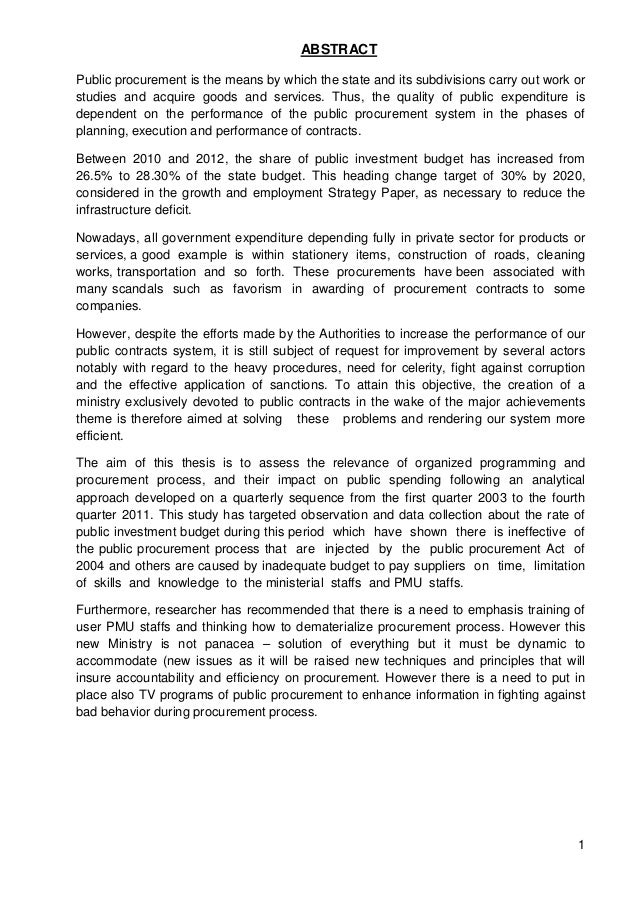 Procurement is the process in which a government body or organization provides goods or services by way of an independent contractor who specializes in the area. There are vast topics to cover in procurement, making the subject ideal for dissertation topics. Here are some great ideas to work with: Should procurement awards consider vendors equally? procurement process and its effectiveness in the time delivery and the quality of the procuring items. The study recommended that Public Procurement Act should adopt strong policy measures on the procurement process since the policy to a large extent show the ways how to act in order to perform better. vii TABLE OF CONTENTS Page INTRODUCTION Public procurement is the process by which government acquires goods, works and services at the right price, delivered at the right place and time of the required quantity and the right quality using public funds. Public procurement has only recently engaged the attention of the people of Sierra blogger.comted Reading Time: 14 mins